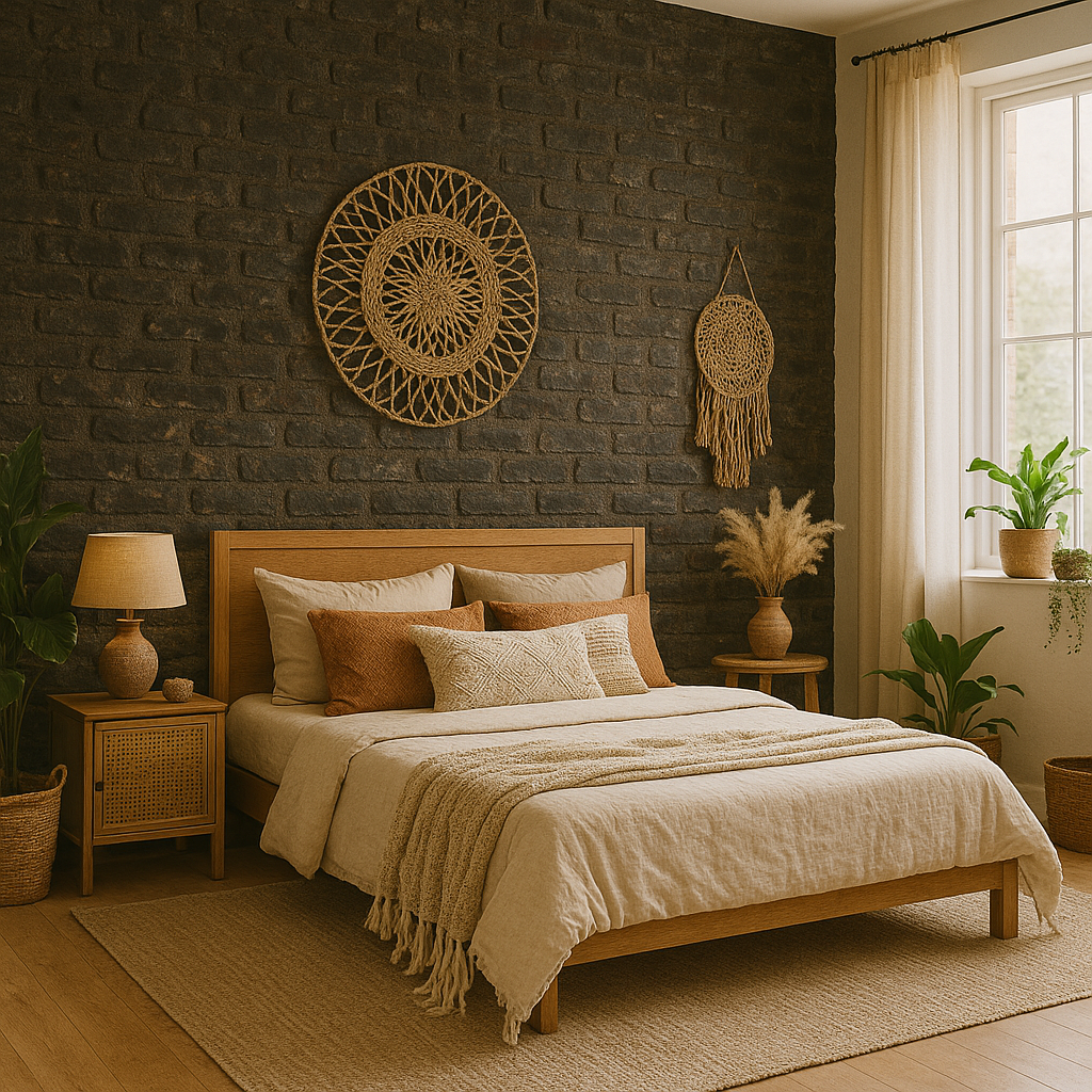 Jak dodatki i dekoracje pasują do czarnej cegły na ścianie w sypialni?