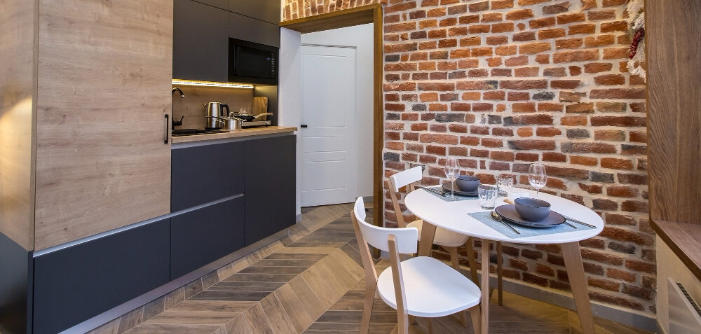 1. Mała kuchnia w bloku – cegła tylko przy jadalni