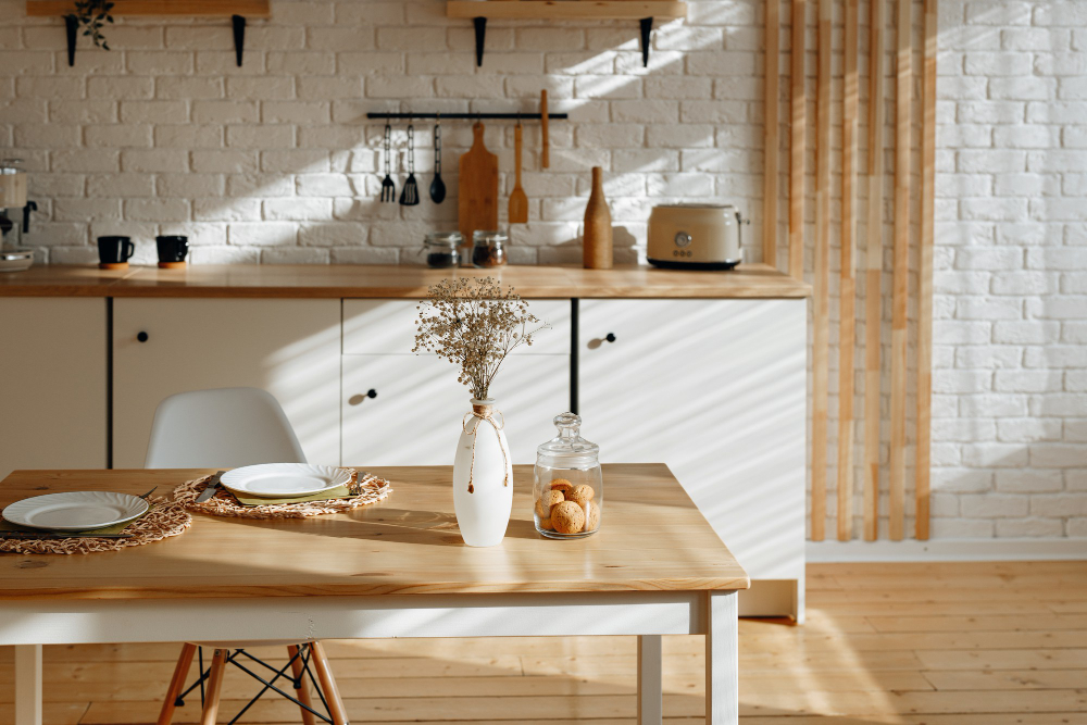 W kuchni liczy się higiena i czytelność. Cegła (szczególnie bielona lub w ciepłej czerwieni) daje charakter, ale łatwo ją przytłumić.