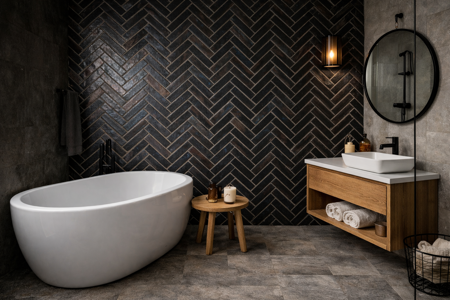 Wąskie prostokątne płytki w czarnym/antracytowym kolorze z naturalnymi przepaleniami i delikatnym efektem iryzacji tworzą unikalny, dekoracyjny efekt.
