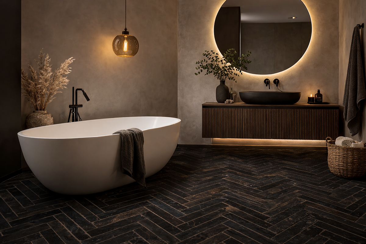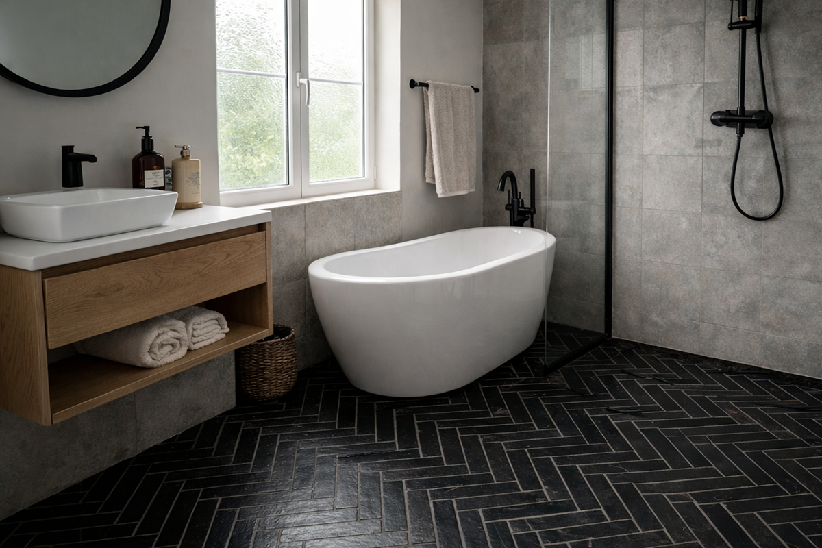 Terakota podłogowa - trwała, impregnowana i odporna na zabrudzenia. Czarne/antracytowe płytki z naturalnymi przepaleniami idealne do wnętrz loftowych i klasycznych.