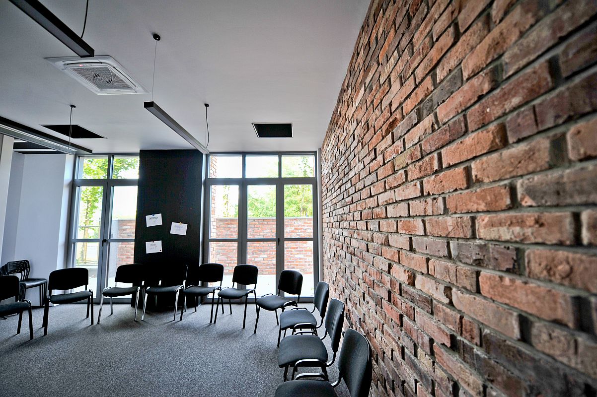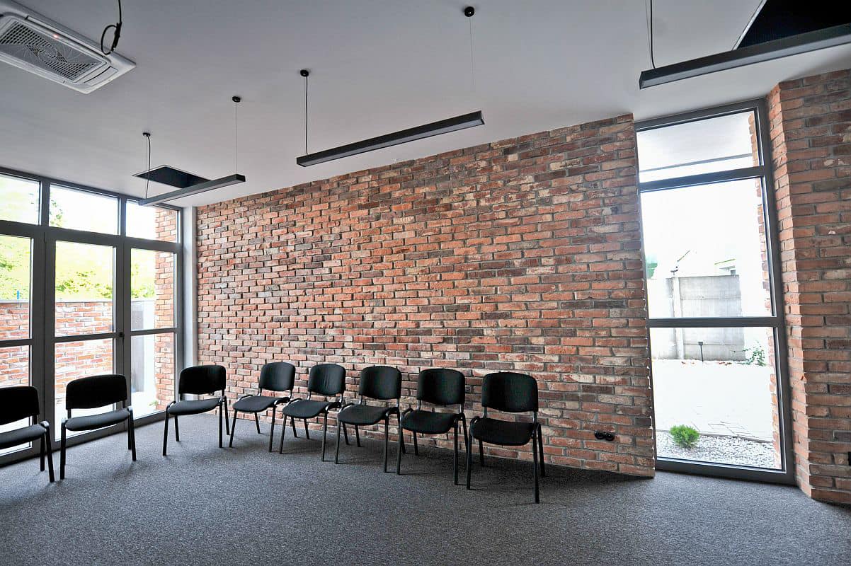 Na zdjęciu prezentujemy nowoczesne biuro zlokalizowane w Bydgoszczy, w którym główną rolę gra nasza płytka z lica cegły rozbiórkowej – model Retro Orange.