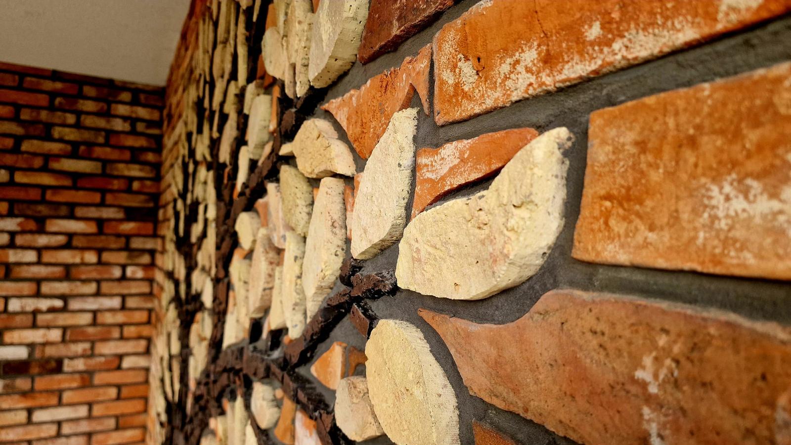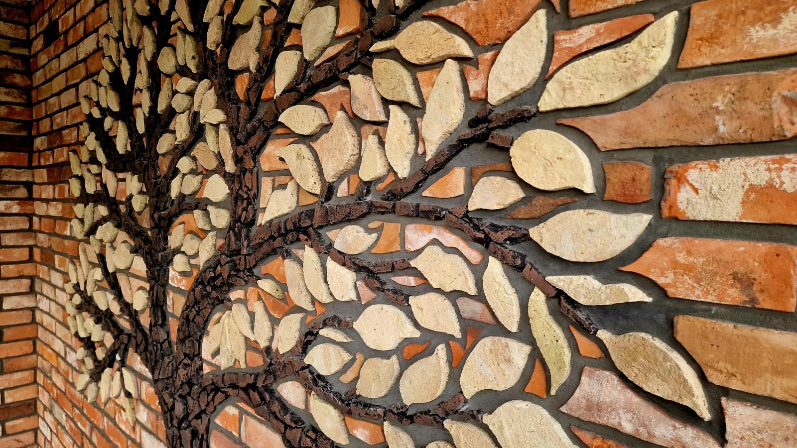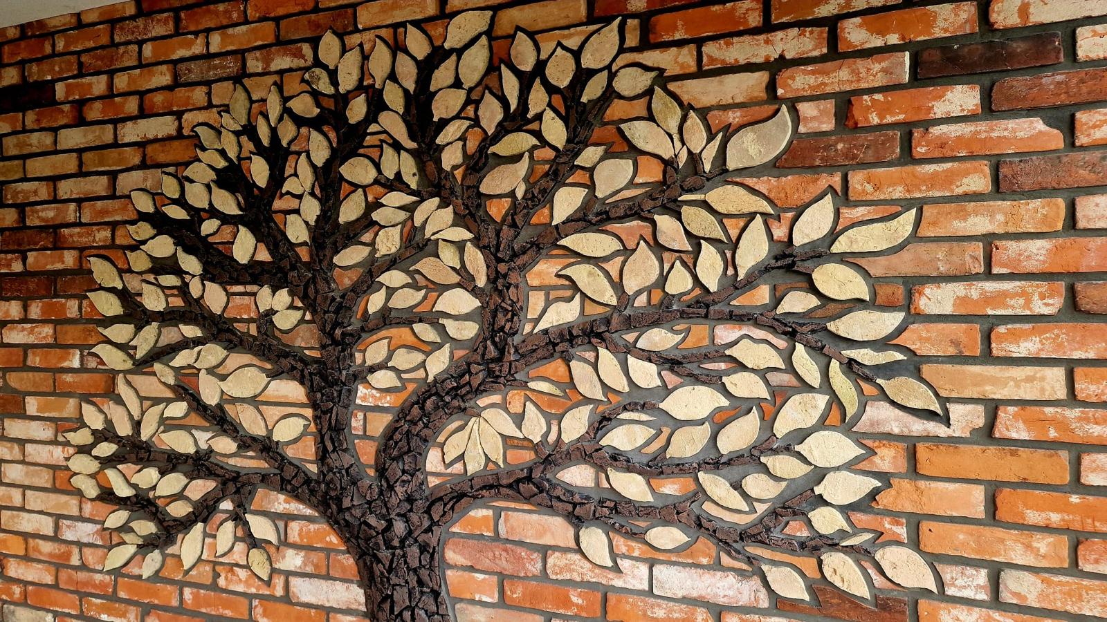 Każdy detal drzewa został misternie wyrzeźbiony i ułożony ręcznie z oryginalnej, starej płytki z cegły rozbiórkowej, pochodzącej z historycznych budynków. Starannie dobrane fragmenty cegieł – z widocznymi śladami czasu, patyną i strukturą nie do podrobienia – tworzą wyjątkową mozaikę wpisaną w architekturę elewacji.