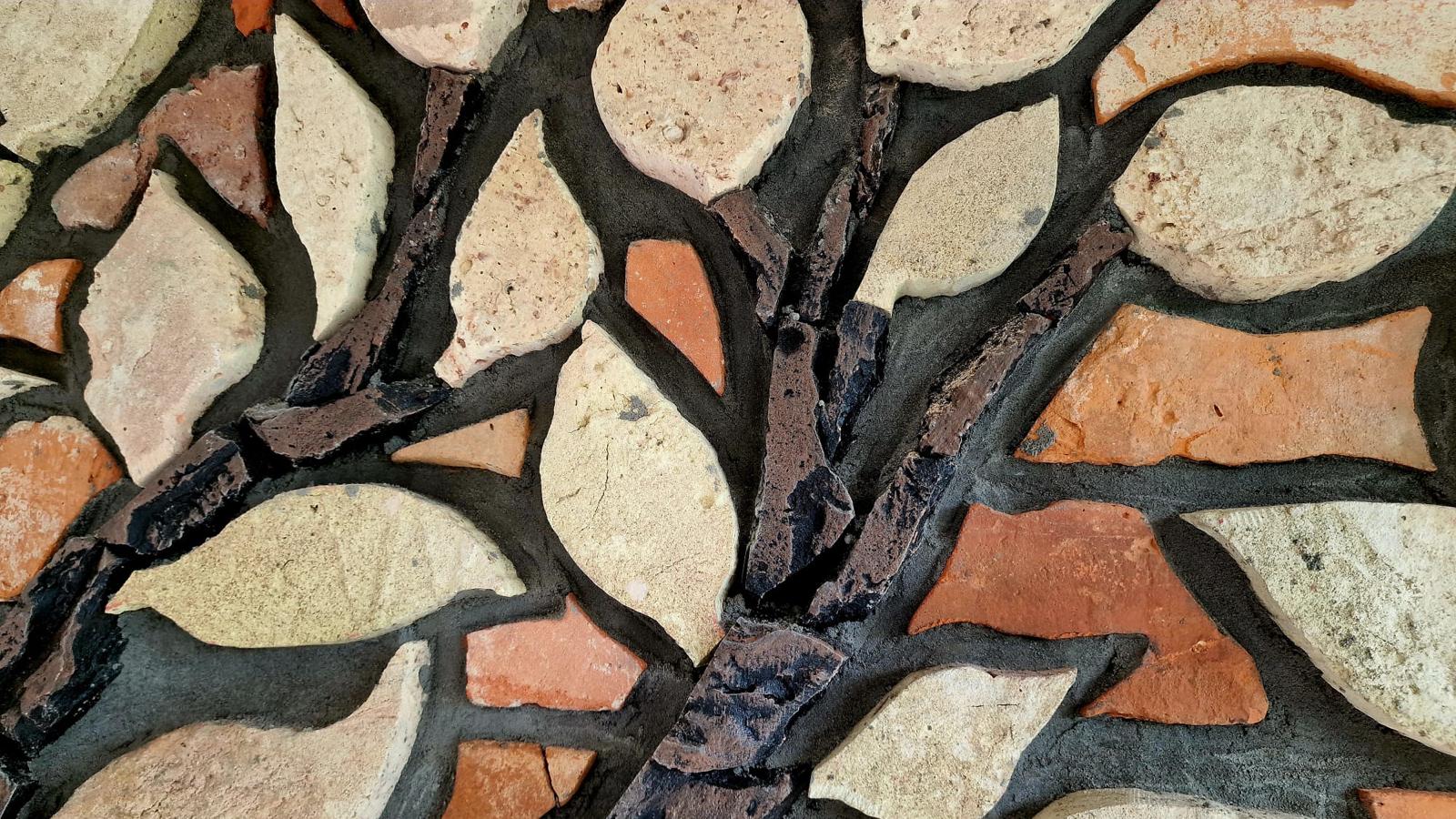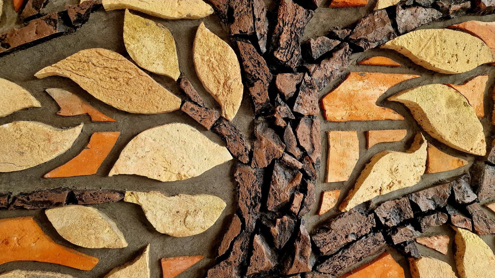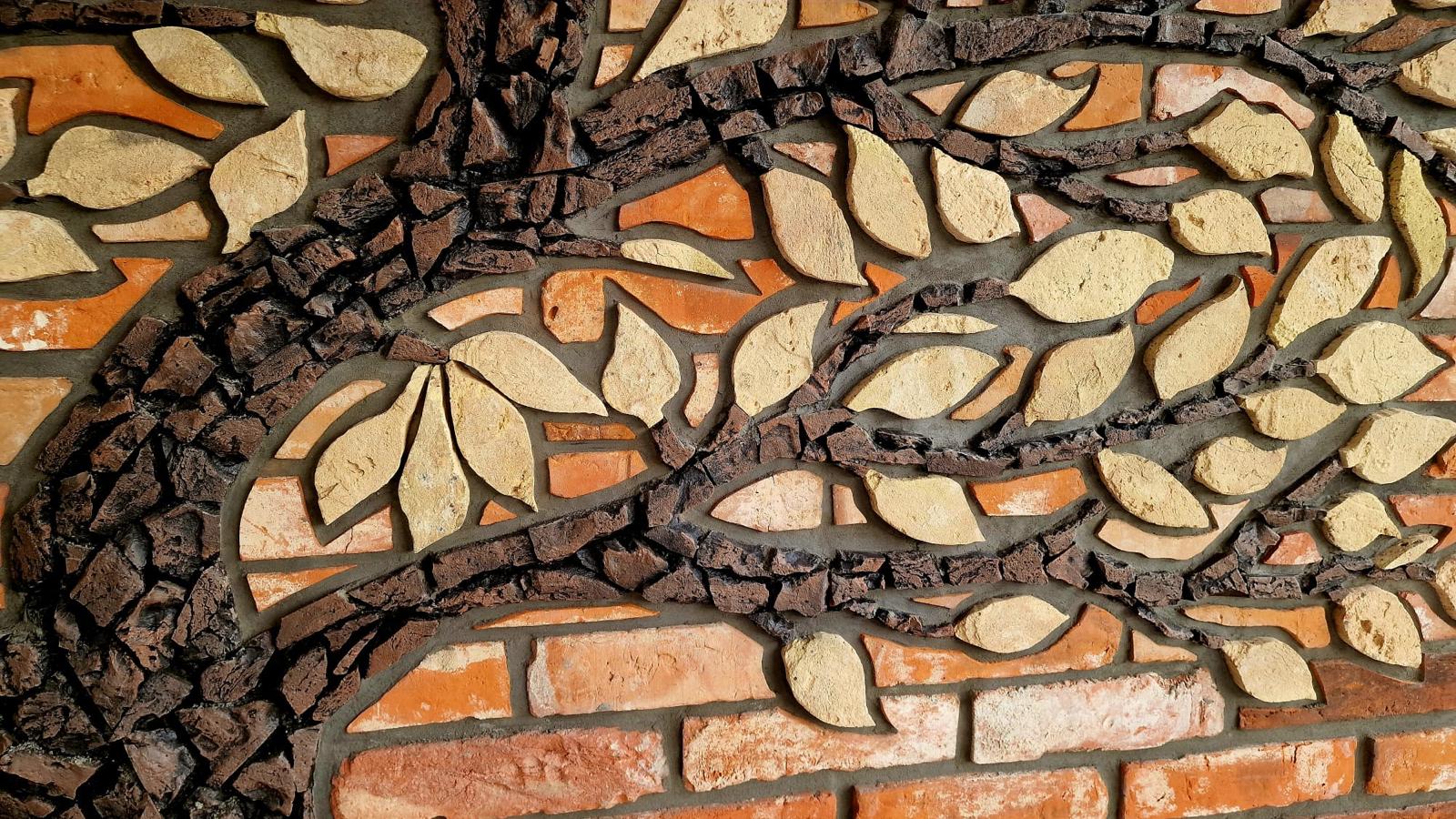 Każdy detal drzewa został misternie wyrzeźbiony i ułożony ręcznie z oryginalnej, starej płytki z cegły rozbiórkowej, pochodzącej z historycznych budynków. Starannie dobrane fragmenty cegieł – z widocznymi śladami czasu, patyną i strukturą nie do podrobienia – tworzą wyjątkową mozaikę wpisaną w architekturę elewacji.