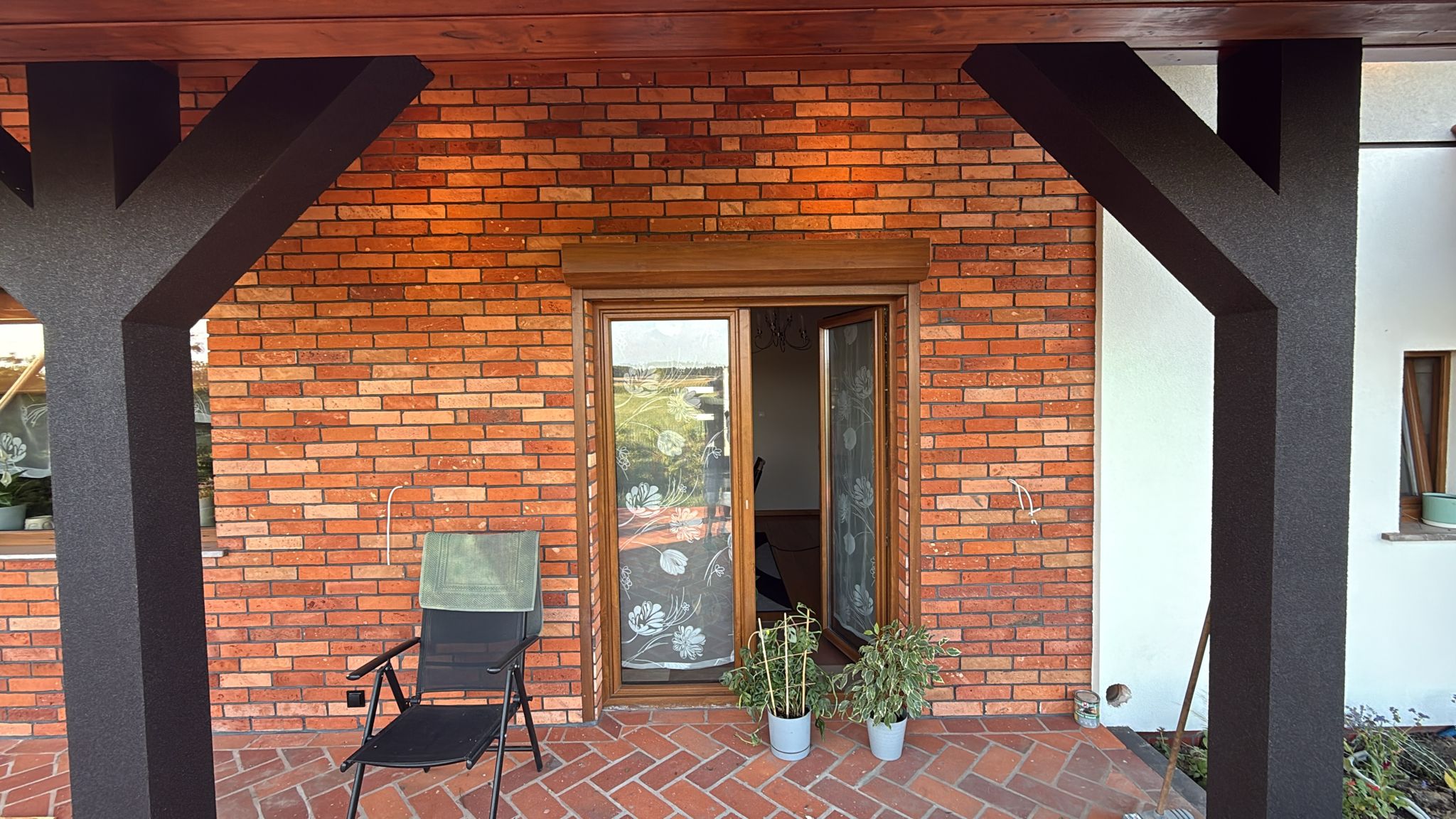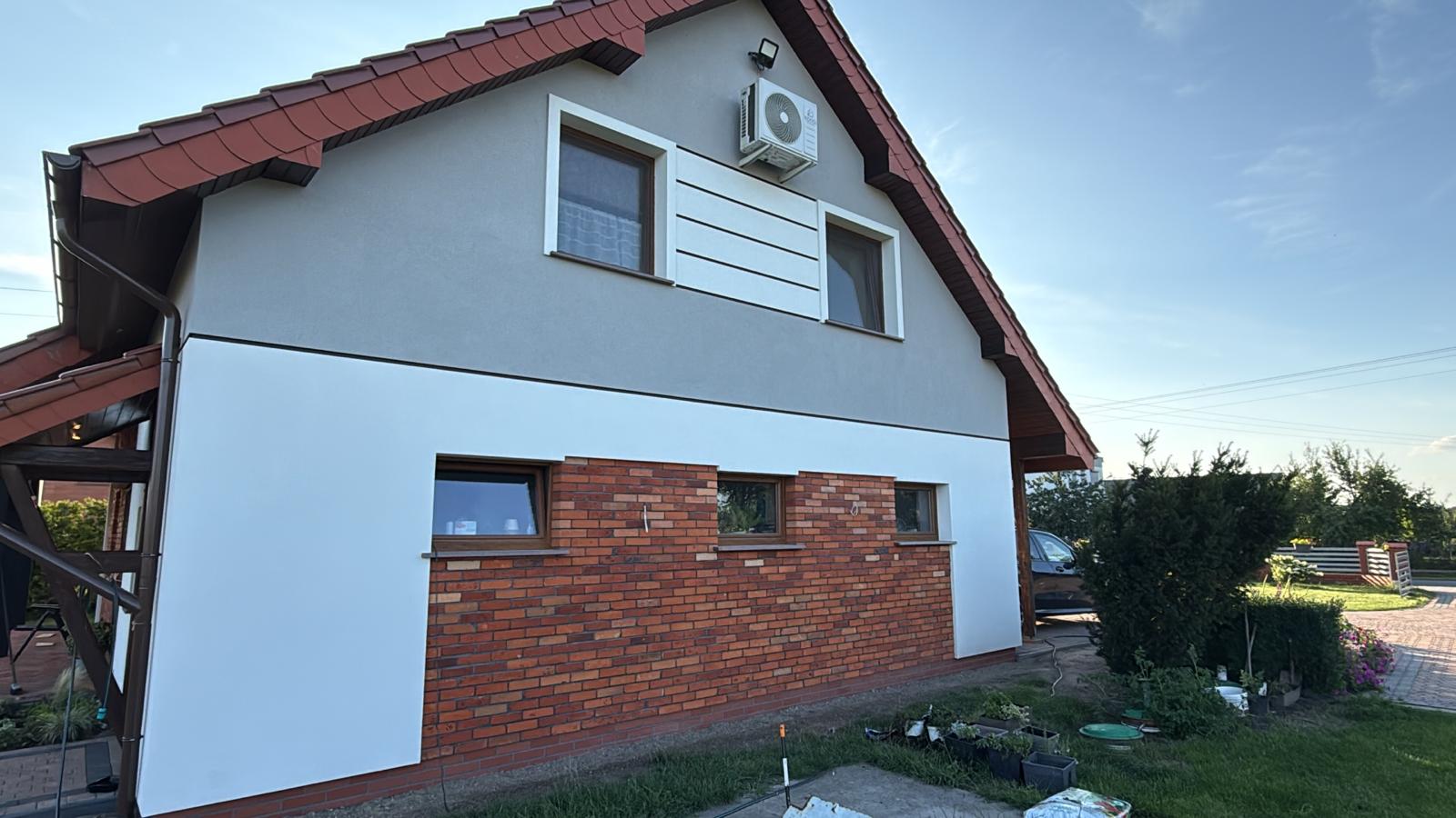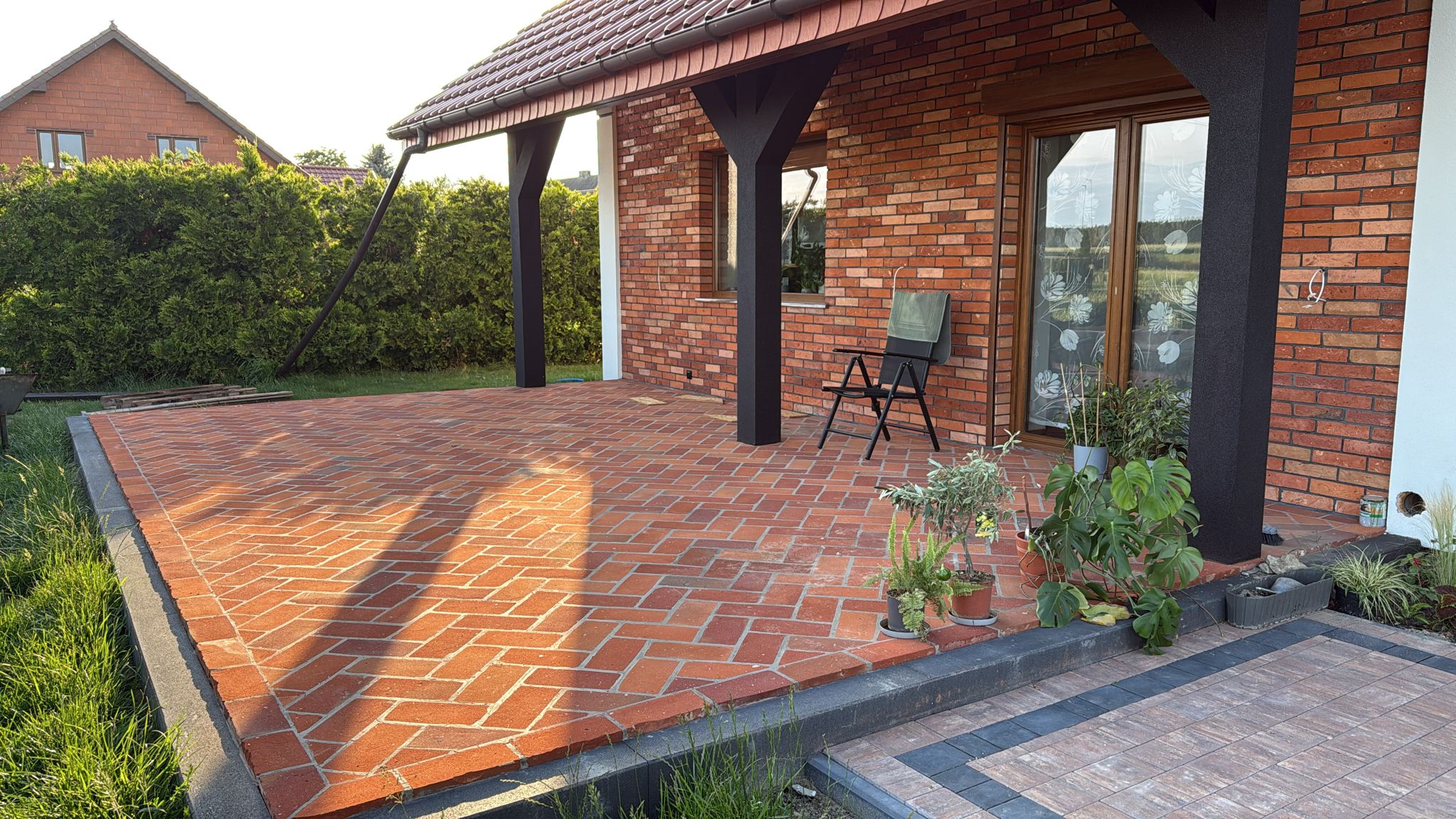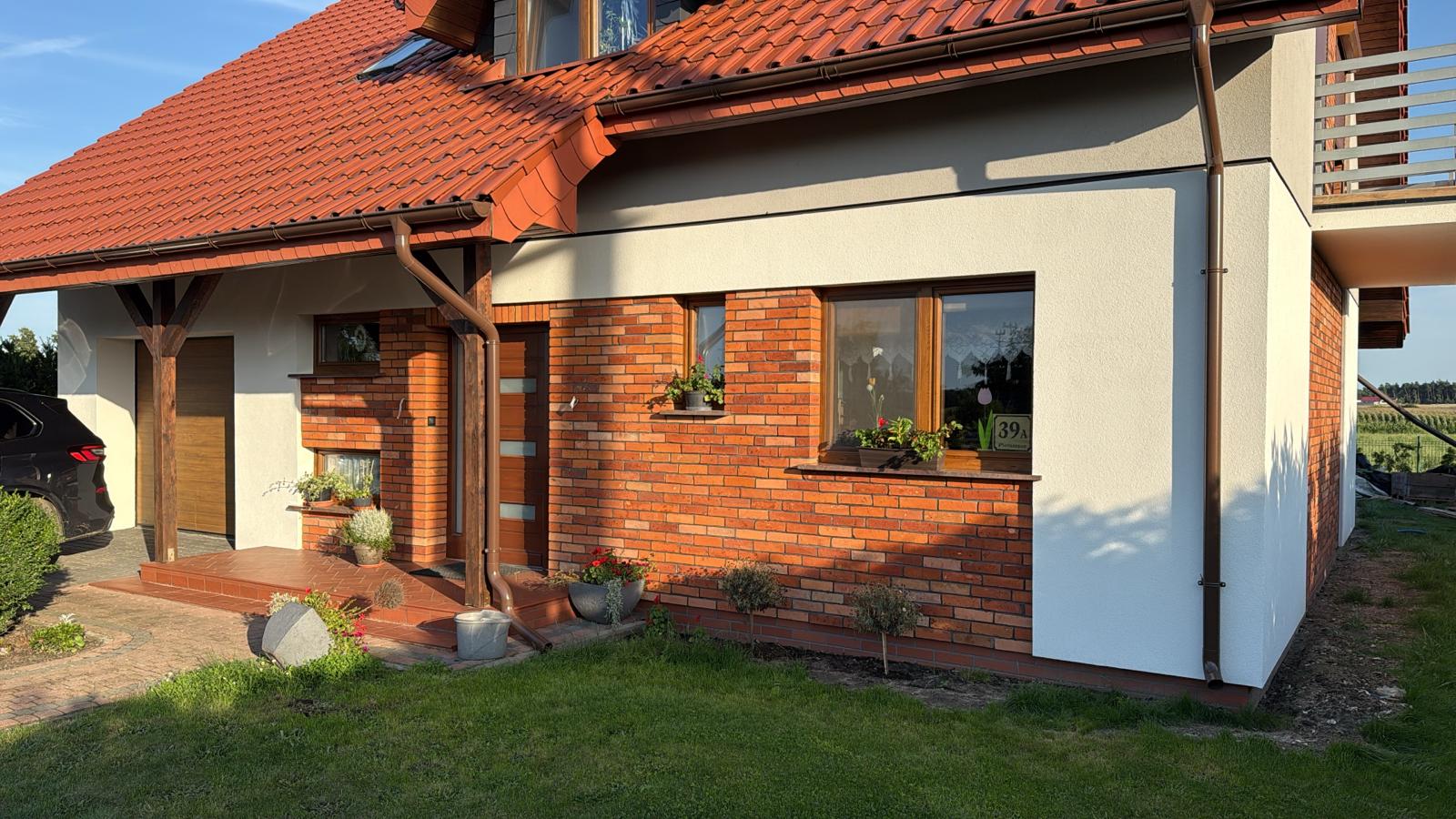 Na tarasie zastosowaliśmy płytki o wymiarze 27 cm w odcieniu krwistej czerwieni, które doskonale współgrają z elewacją. Intensywna barwa płytek harmonizuje z czerwonym dachem budynku i pięknie kontrastuje z otaczającą zielenią ogrodu.
