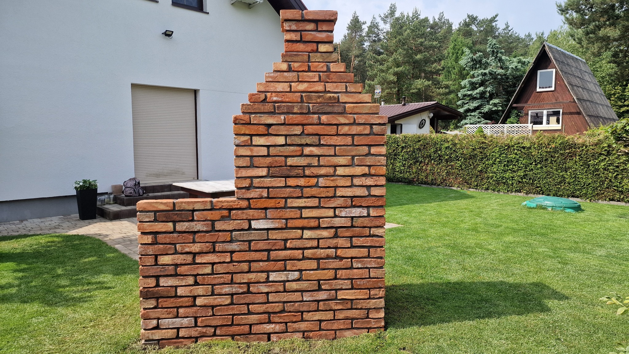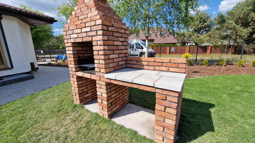 Praktyczny i estetyczny grill ogrodowy wykonany z ręcznie układanej cegły czerwonej z zastosowaniem ciemnoszarej fugi, która podkreśla rustykalny charakter konstrukcji. Projekt łączy klasyczny wygląd z funkcjonalnością – posiada przestronną część roboczą z blatem z płyt granitowych, miejsce do przechowywania opału oraz solidne palenisko z rusztem.