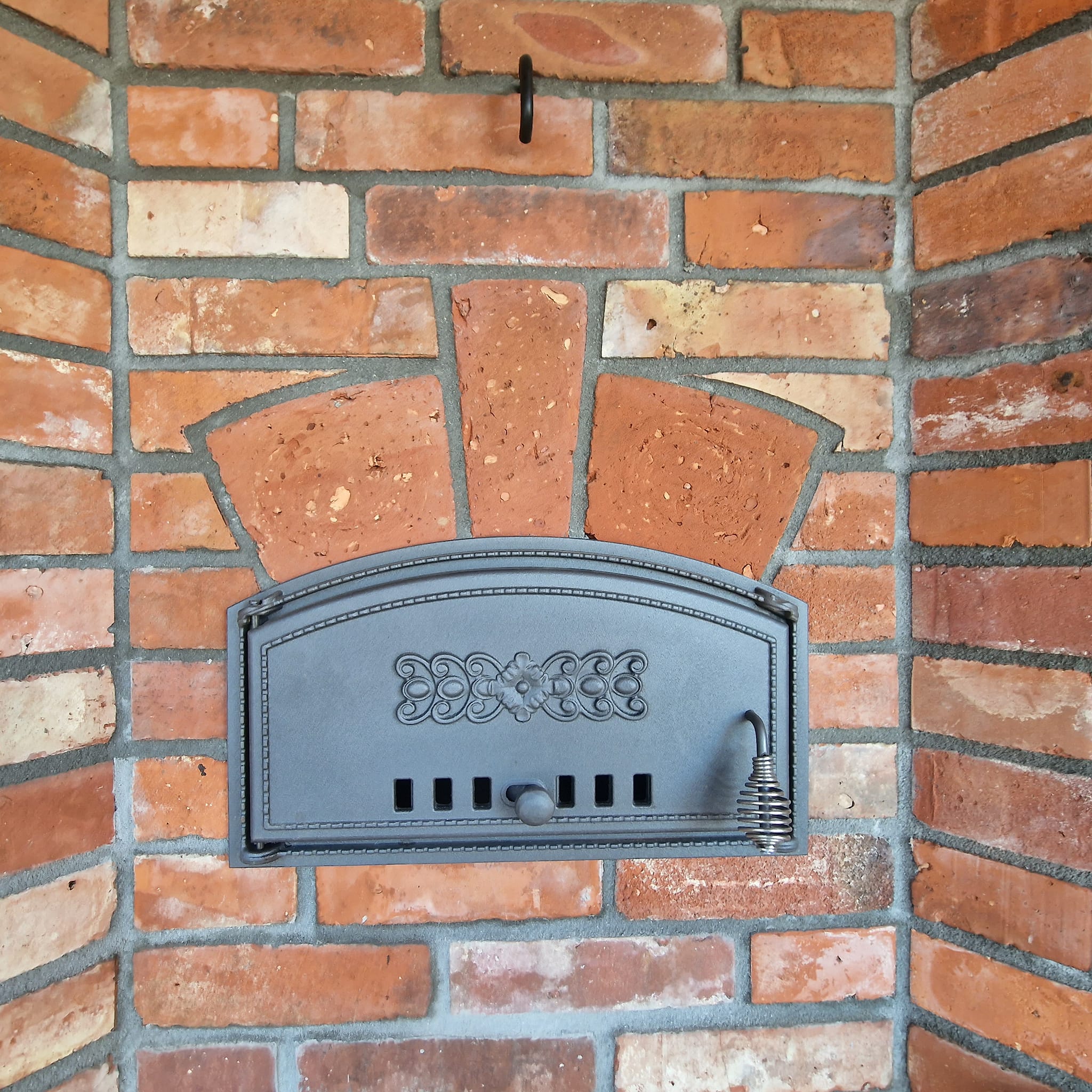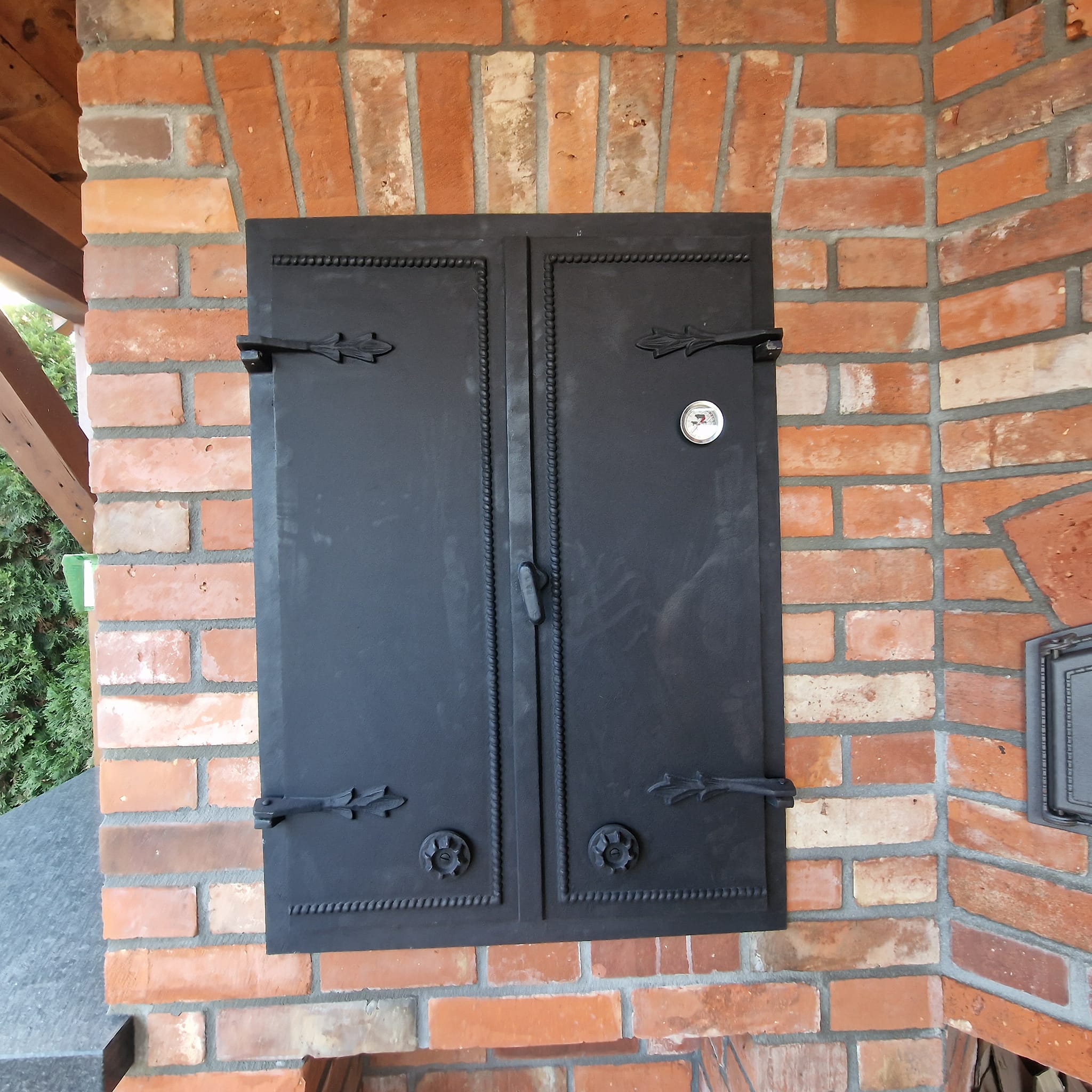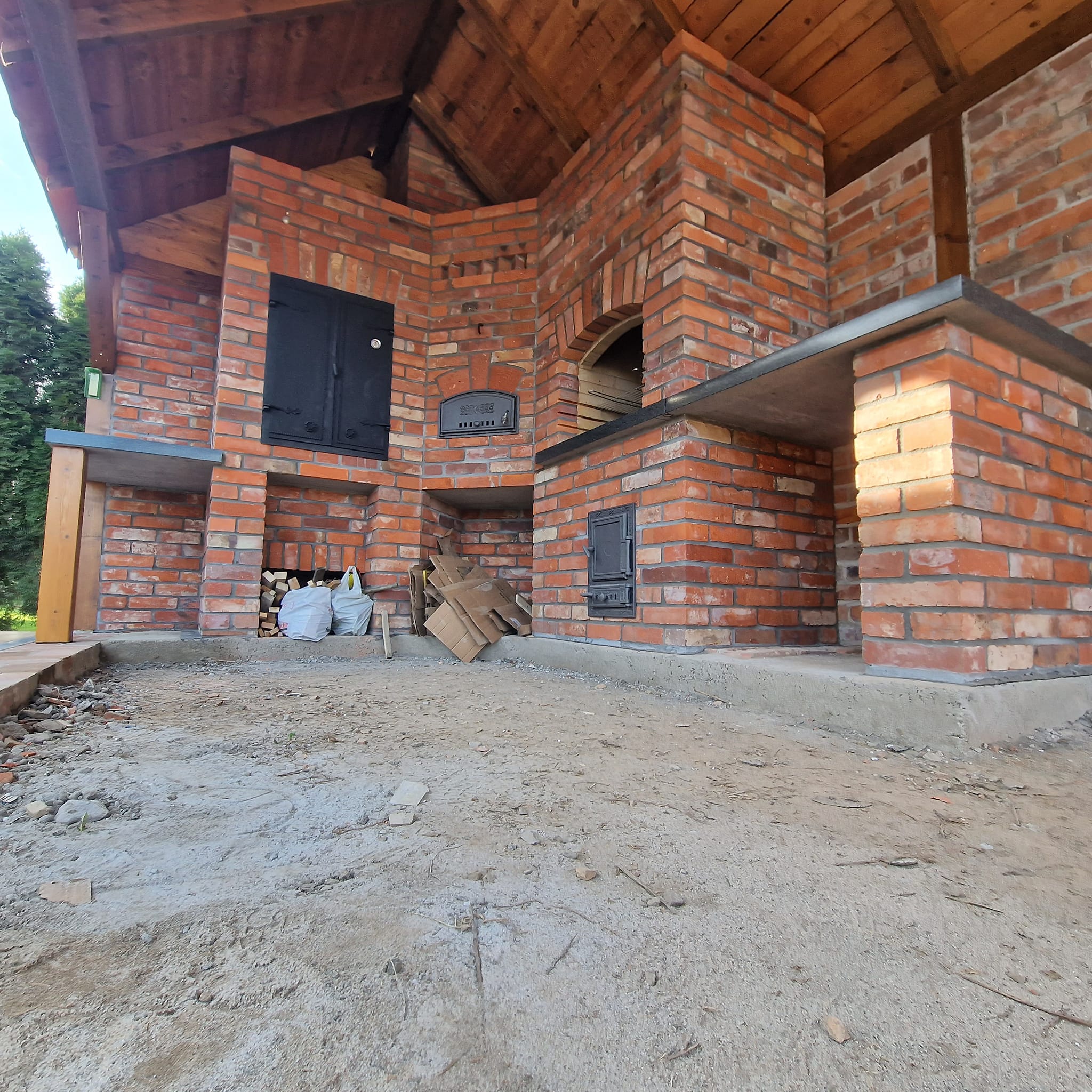 Zabudowa została starannie dopracowana – od solidnego fundamentu po praktyczne wnęki na drewno opałowe i akcesoria. Czarna żeliwna stolarka drzwiowa podkreśla rustykalny charakter całości, a drewniane zadaszenie chroni przed warunkami atmosferycznymi, umożliwiając korzystanie przez cały rok.