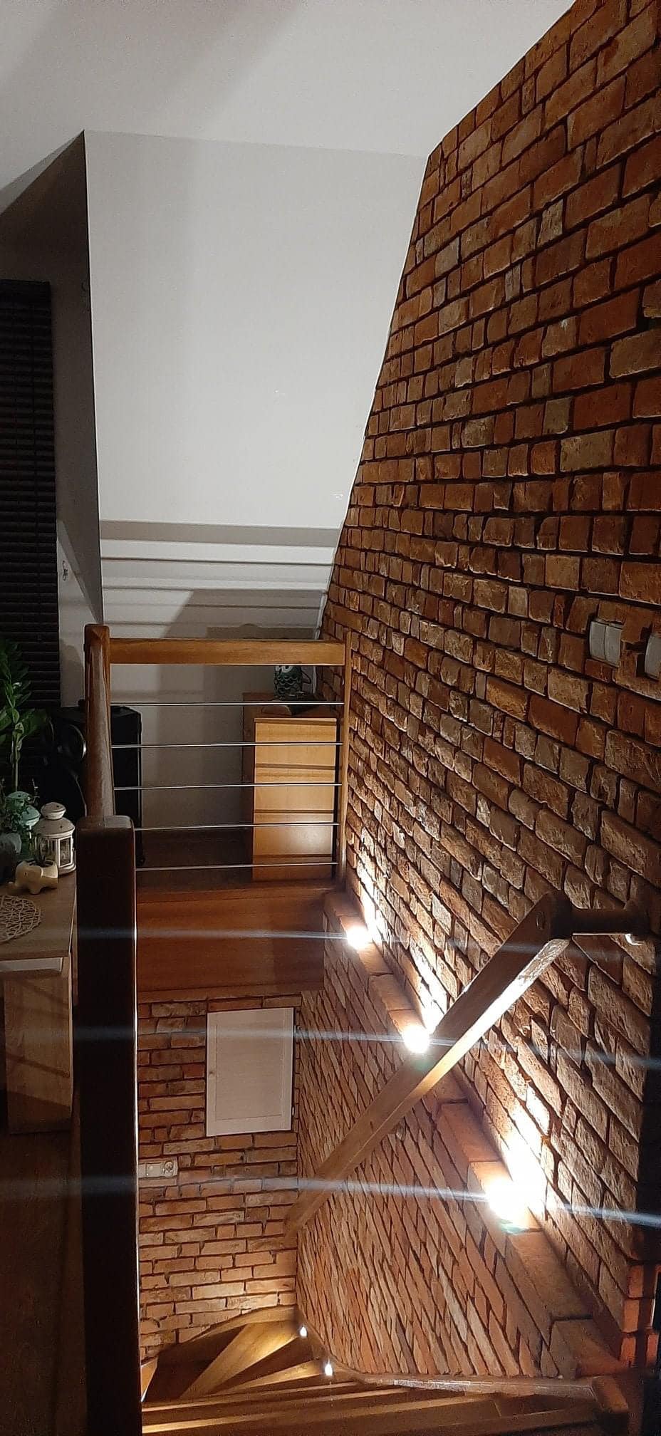 Płytki ze starej cegły OLD WALL / MUR HISTORYCZNY to wyjątkowy materiał, który nadaje wnętrzom niepowtarzalny charakter. Na klatce schodowej tworzą ciepłą, przytulną atmosferę, jednocześnie podkreślając solidność i elegancję budynku.