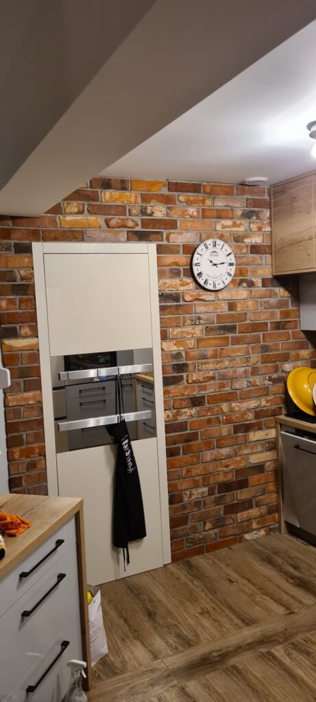Ceglana ściana w kuchni – płytka ze starej cegły calibrated, fuga ciemna