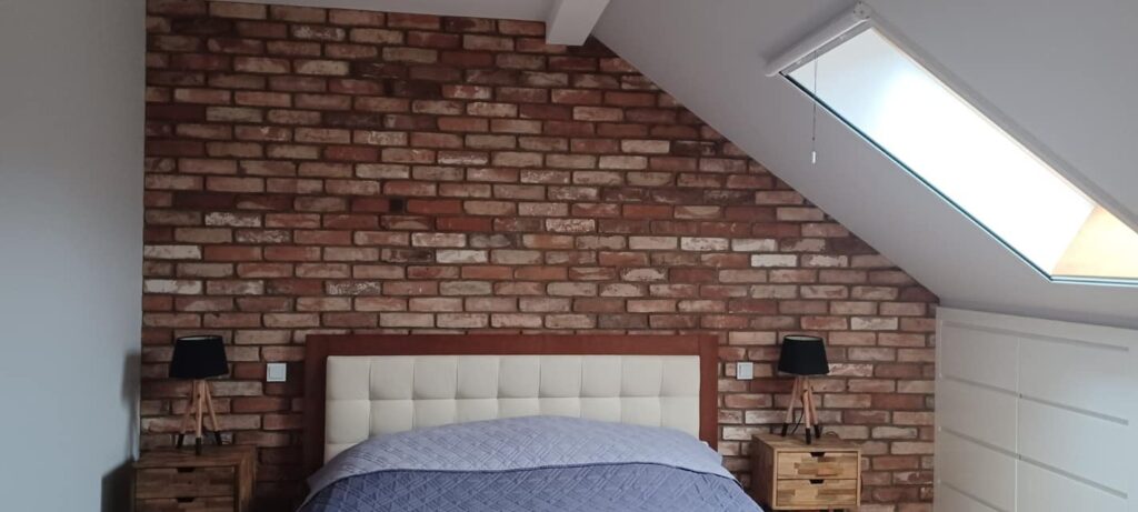 Sypialnia z cegły Retro – płytka z cegły rozbiórkowej czerwona z fugą ciemnoszarą