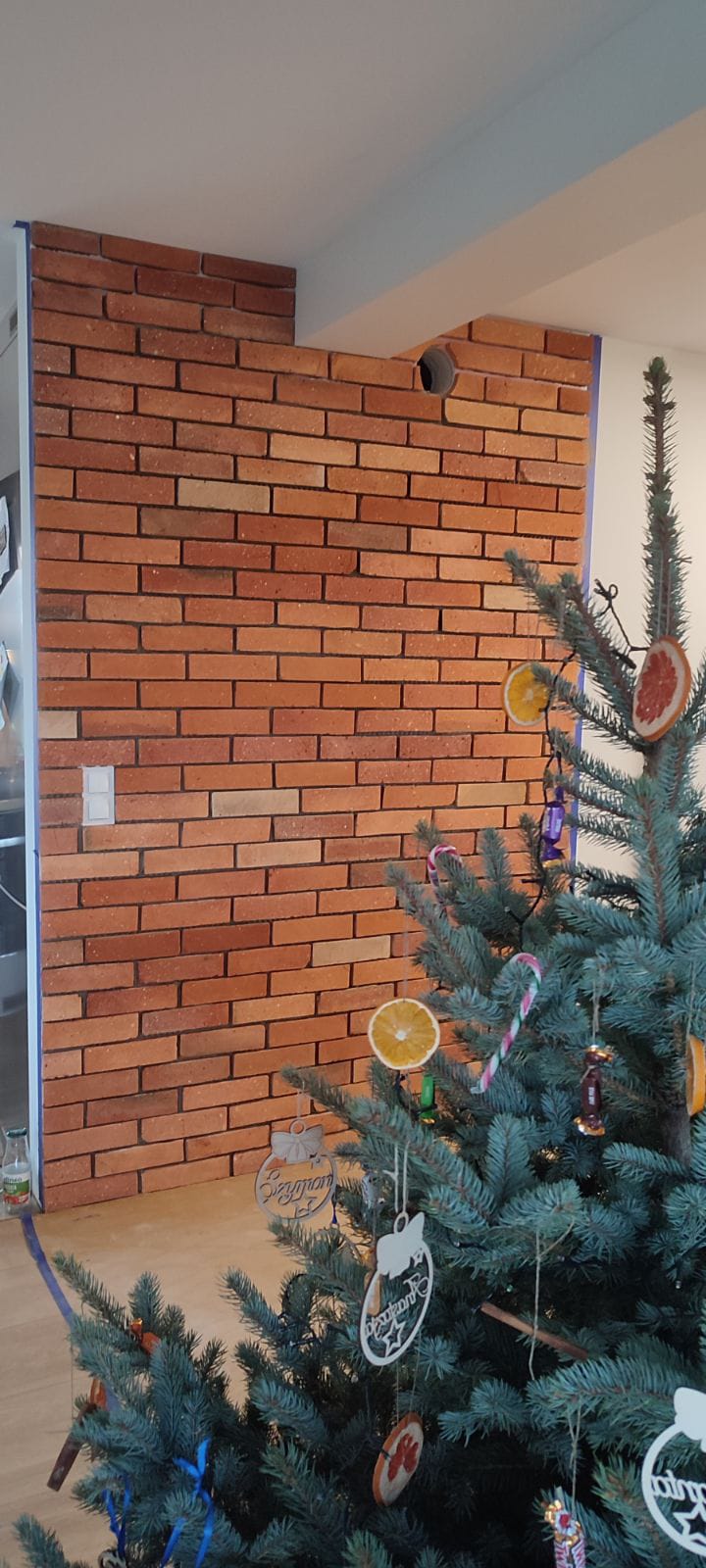 Ciepłe pomarańczowe tony cegły idealnie współgrają ze świątecznymi dekoracjami, tworząc przytulne i nastrojowe tło dla choinki i bożonarodzeniowych ozdób. Surowa faktura starej cegły w połączeniu z delikatnym światłem lampek buduje we wnętrzu wyjątkową atmosferę – pełną ciepła, rodzinności i magii świąt.