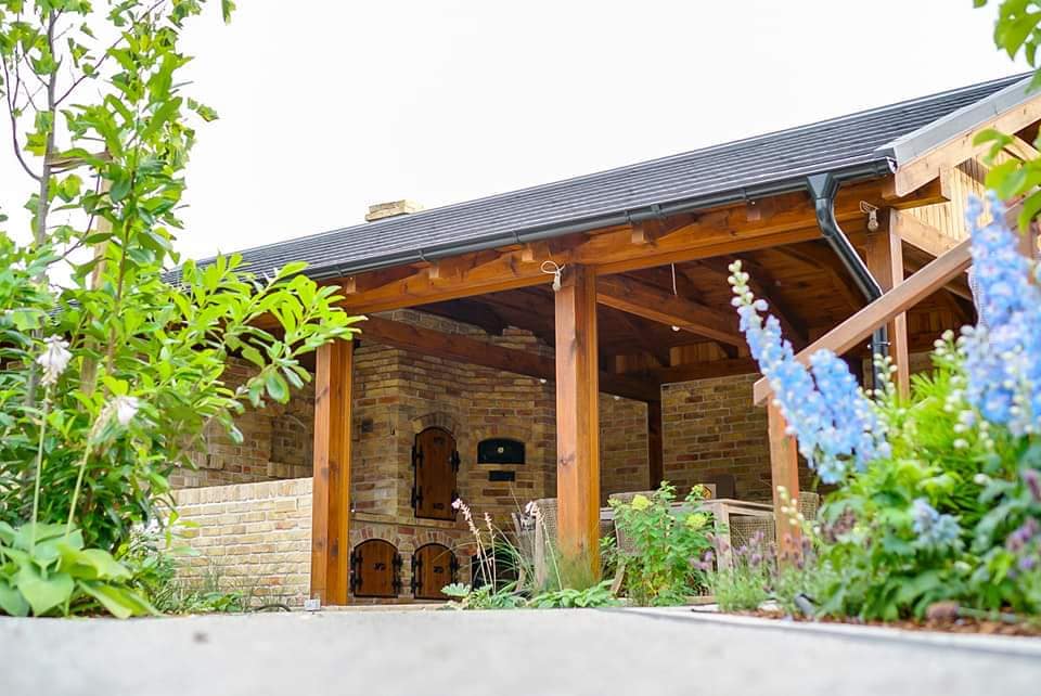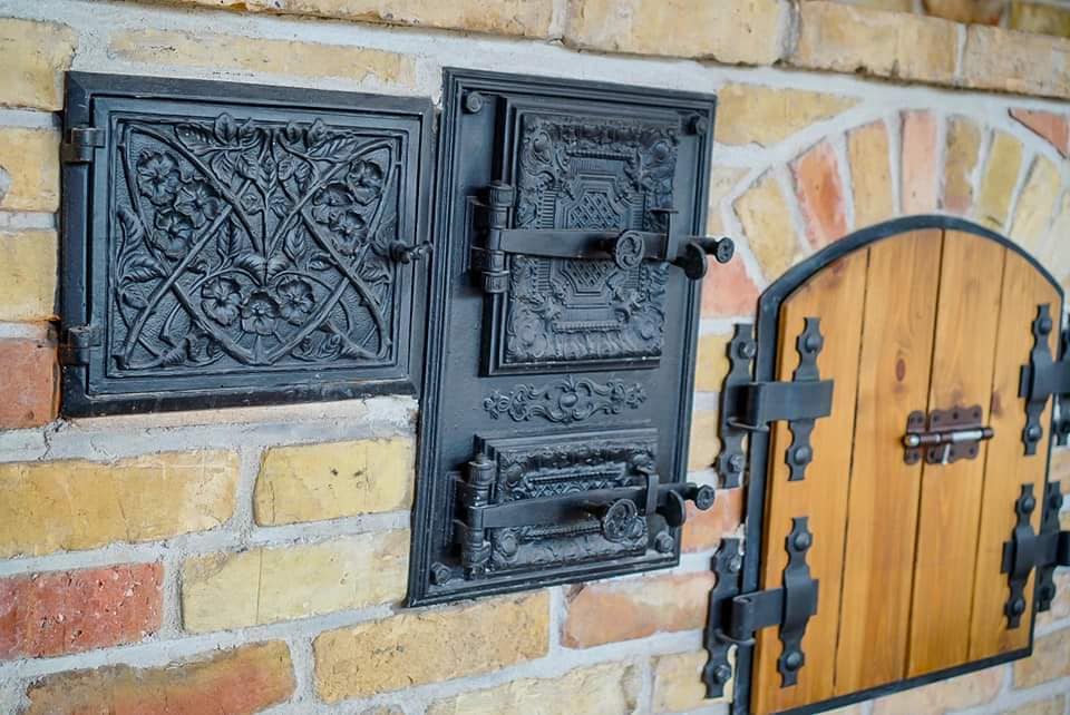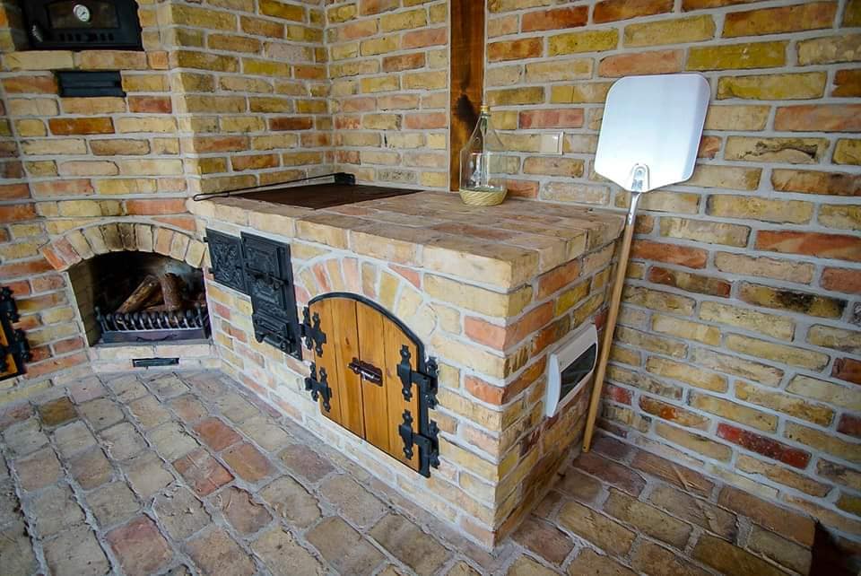 Wielofunkcyjny piec i wędzarnia wykonane z cegły retro, będące sercem ogrodowej kuchni,