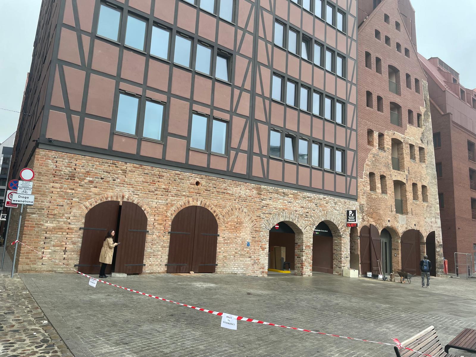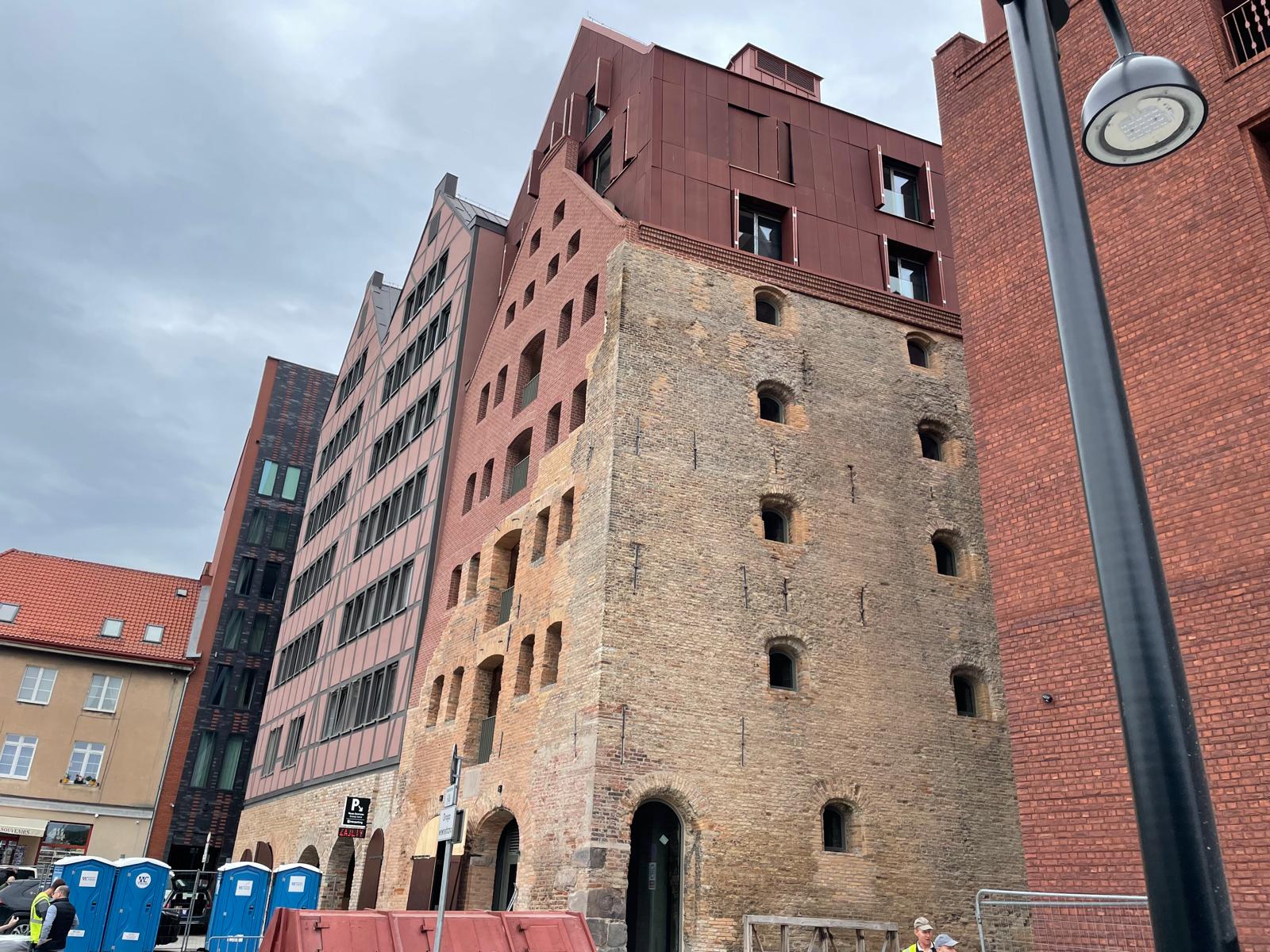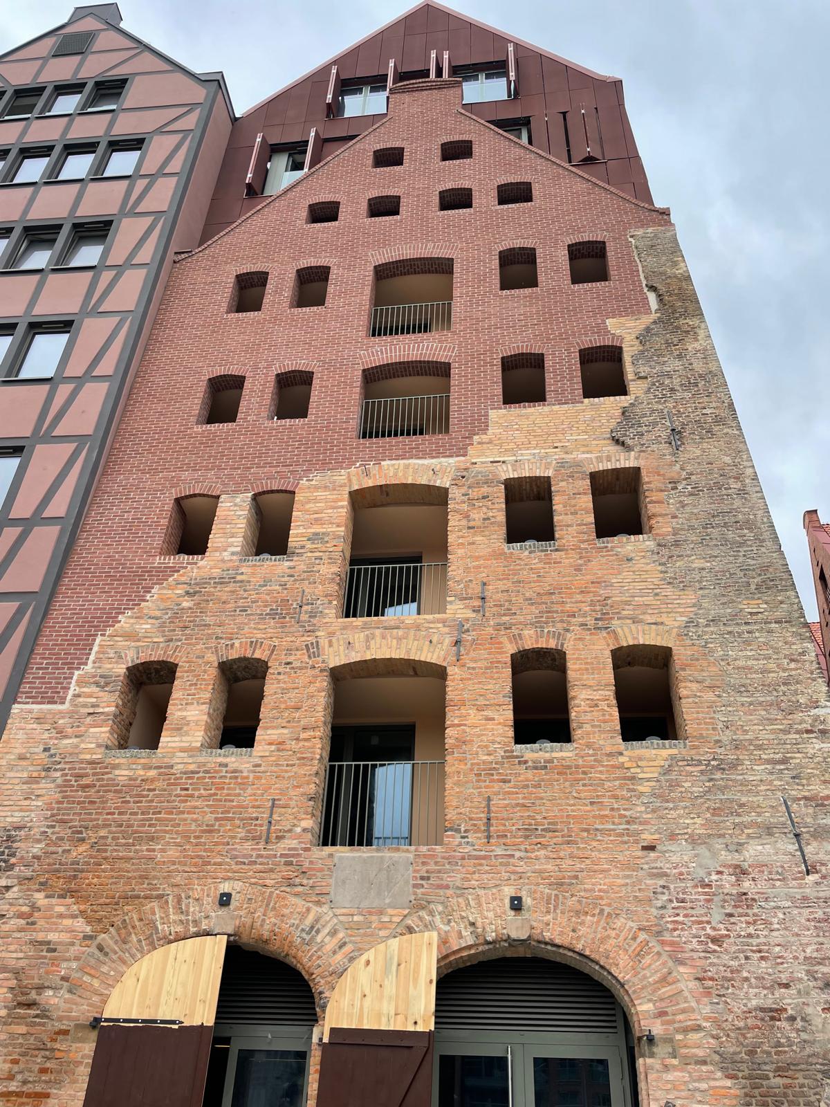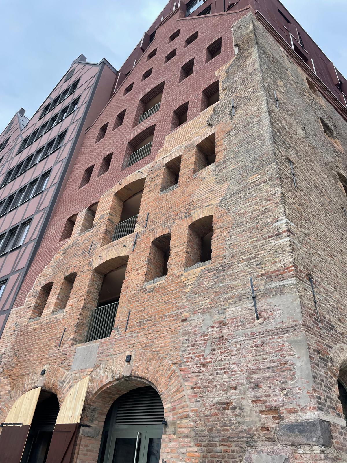Nadbudowa elewacji nad odrestaurowanym murem na ul. Motławska 2, Wyspa Spichrzów, Gdańsk