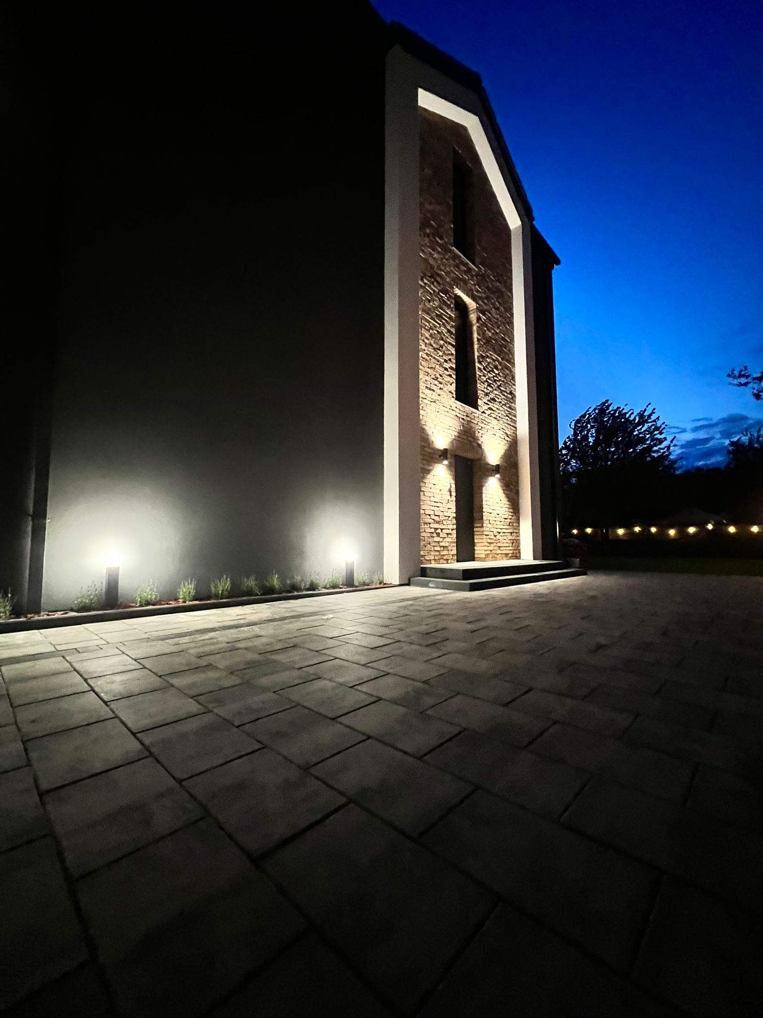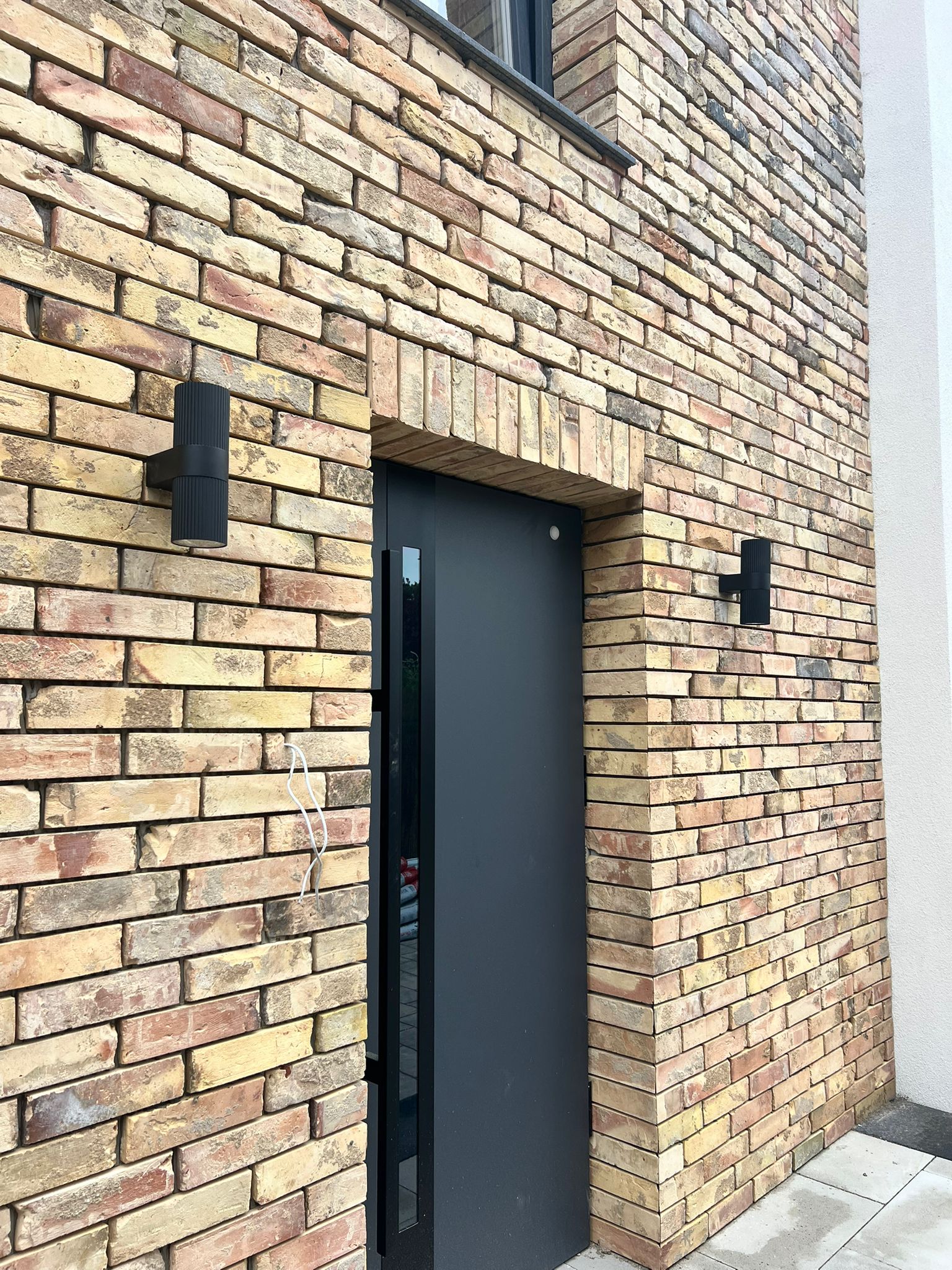 Kontrastowa, antracytowa fuga podkreśla strukturę i rysunek cegły, nadając ścianom głębię i elegancję. Całość doskonale wpisuje się w nadmorski krajobraz – połączenie kolorystyki elewacji z otaczającą przyrodą tworzy harmonijną, przytulną przestrzeń.
